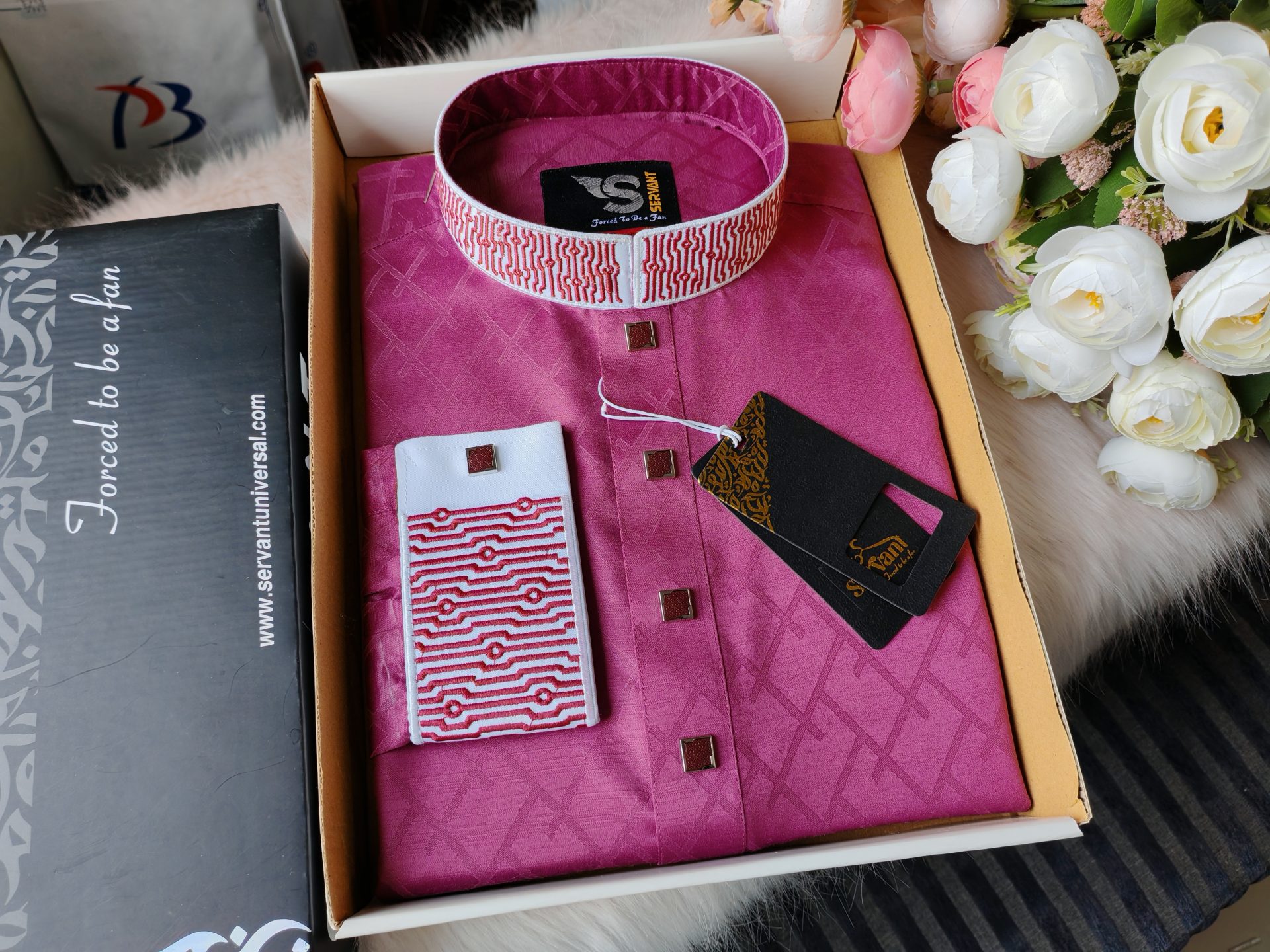 A royal addition to your wardrobe for a bold and elegant look! This premium *Jacquard fabric* Panjabi is designed for both comfort and durability. The exquisite *embroidery details* and *double cuff sleeves* enhance its stylish appeal. The deep *Magenta Fuchsia tone* adds a unique and classy touch, making it perfect for any special occasion.