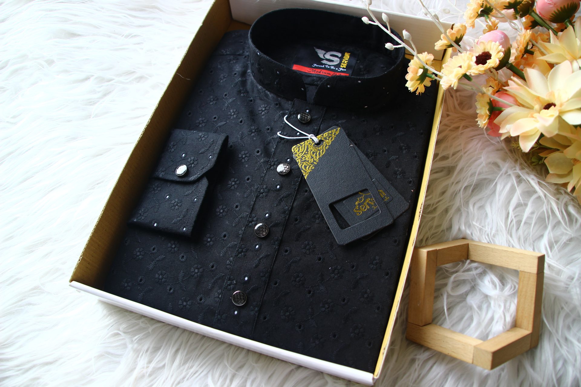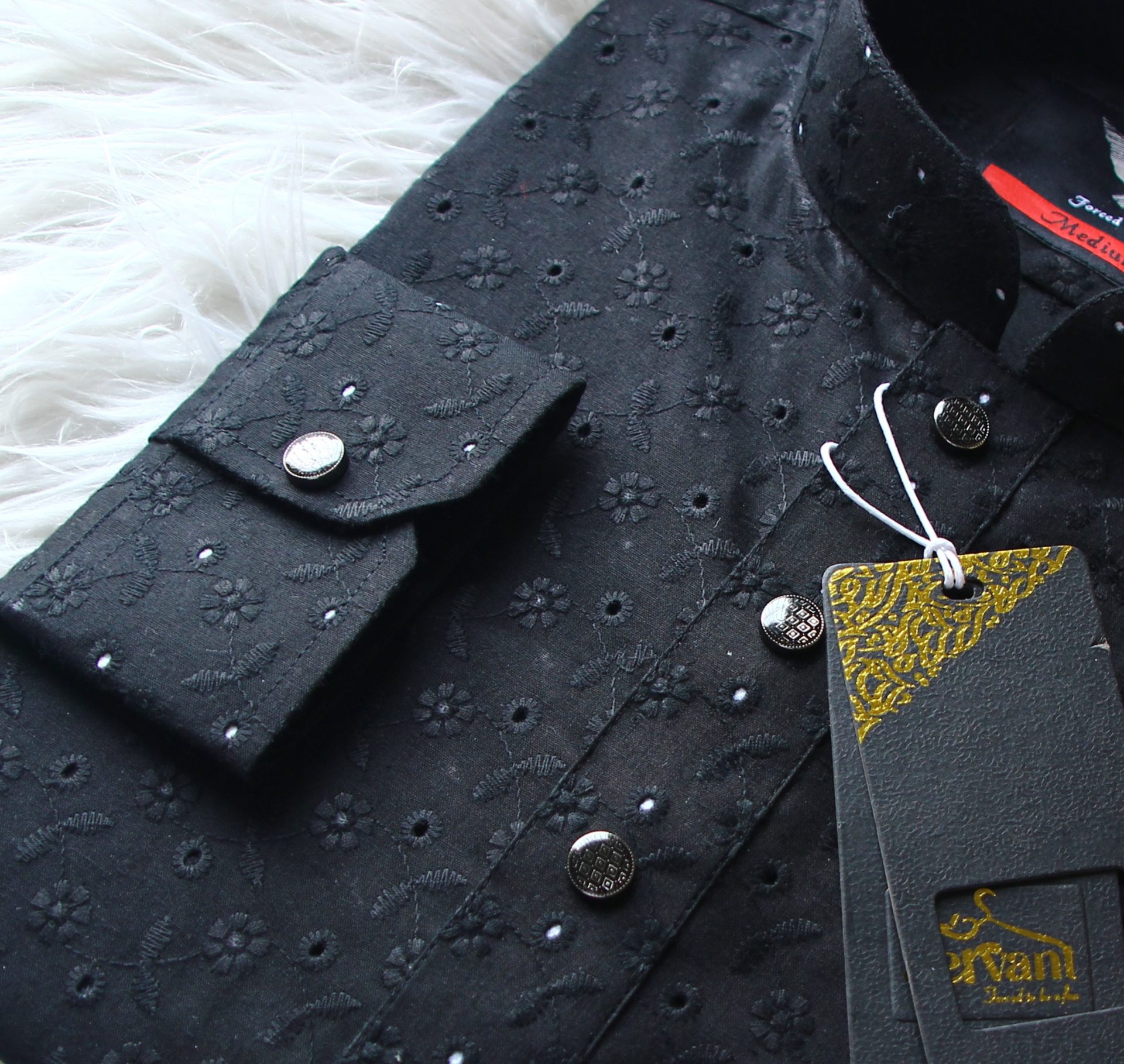 Black Round Flower Hall Design Chicken Cotton Cuff Premium Punjabi