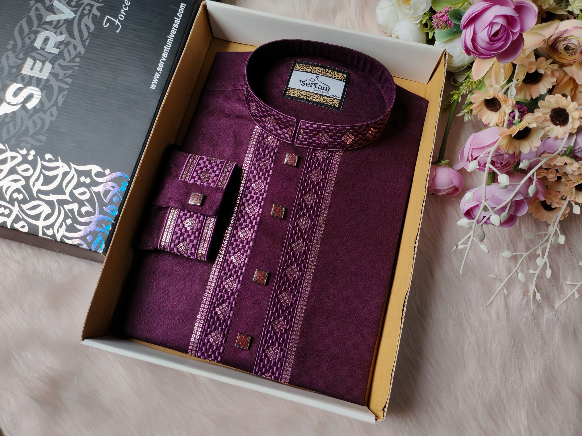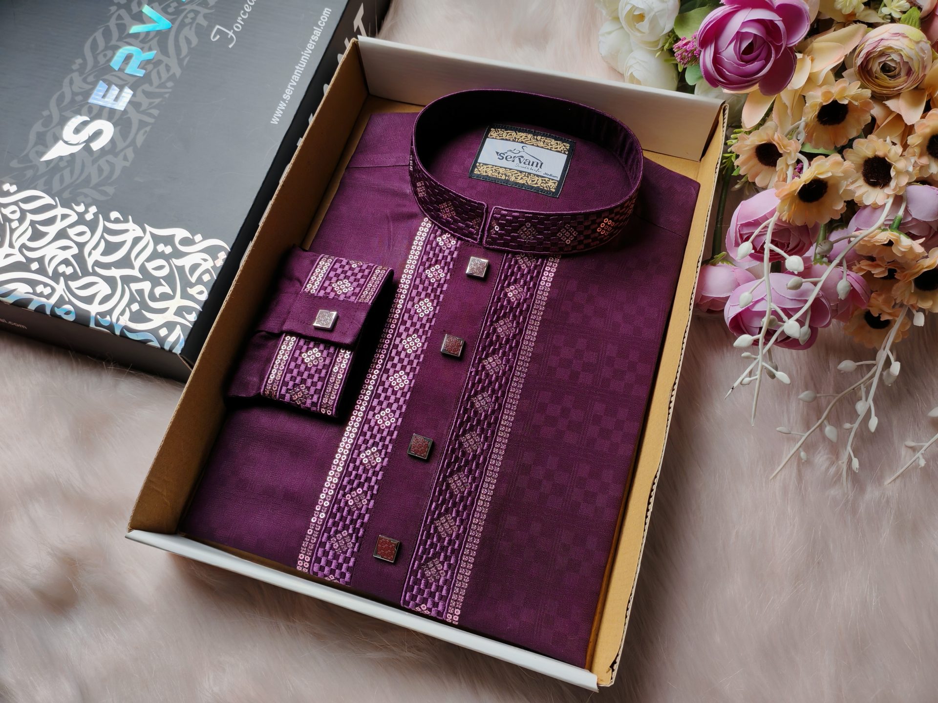 Elevate your festive style with our *Royal Purple Biscose Cotton Embroidered Panjabi* – a masterpiece of elegance and sophistication. Designed for those who appreciate fine craftsmanship, this Panjabi blends premium *biscose cotton fabric* with intricate *embroidery and sequin work*, creating a regal and refined look.