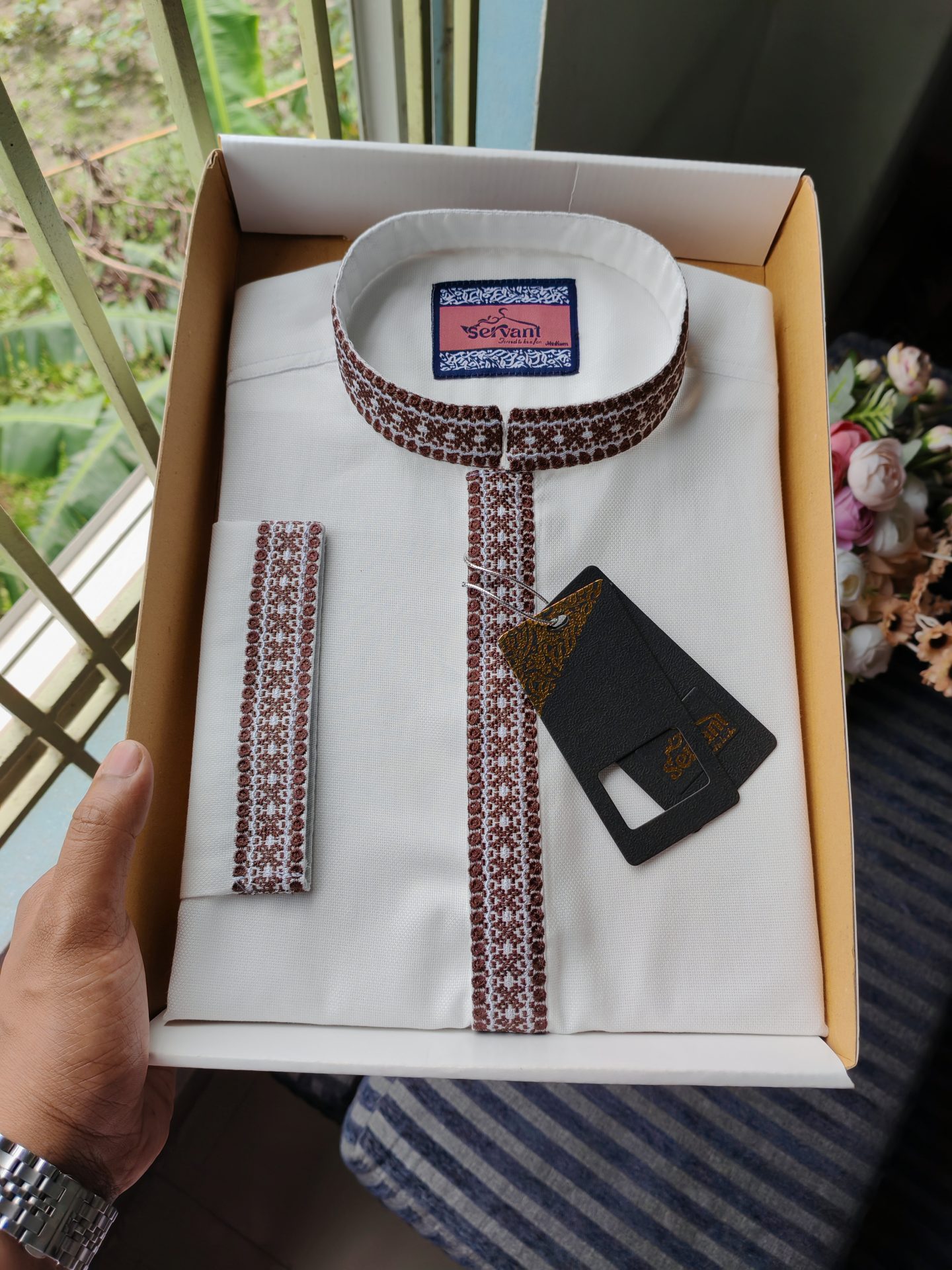 Milk Cream Embroidery Double Plate Premium Panjabi